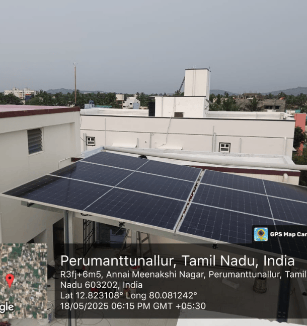 A 3kWp rooftop solar power system was installed at a residence in Kalaiselvi Illam, Perumattunallur, Guduvancheri. The system ensures consistent power generation, reduced electricity bills, and promotes sustainable living through clean energy adoption.