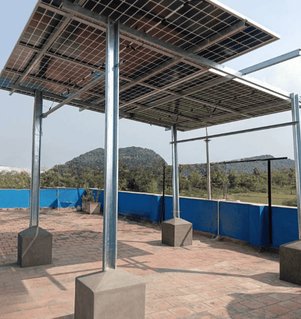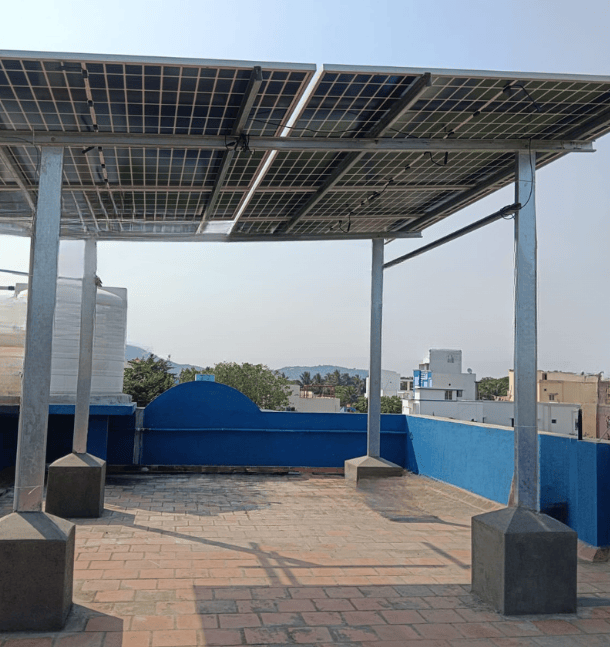 We have successfully installed a 4KWp rooftop solar power plant for Mr. Balamurugan, Founder of Murugan Industrial Gas Agencies, at Mahindra World City, Chengalpet. The solar panels are mounted on an extra high rise structure, specially designed to ensure optimal sun exposure and zero shadow interference throughout the day. This elevated setup also enhances the airflow around the panels, contributing to improved efficiency and performance.